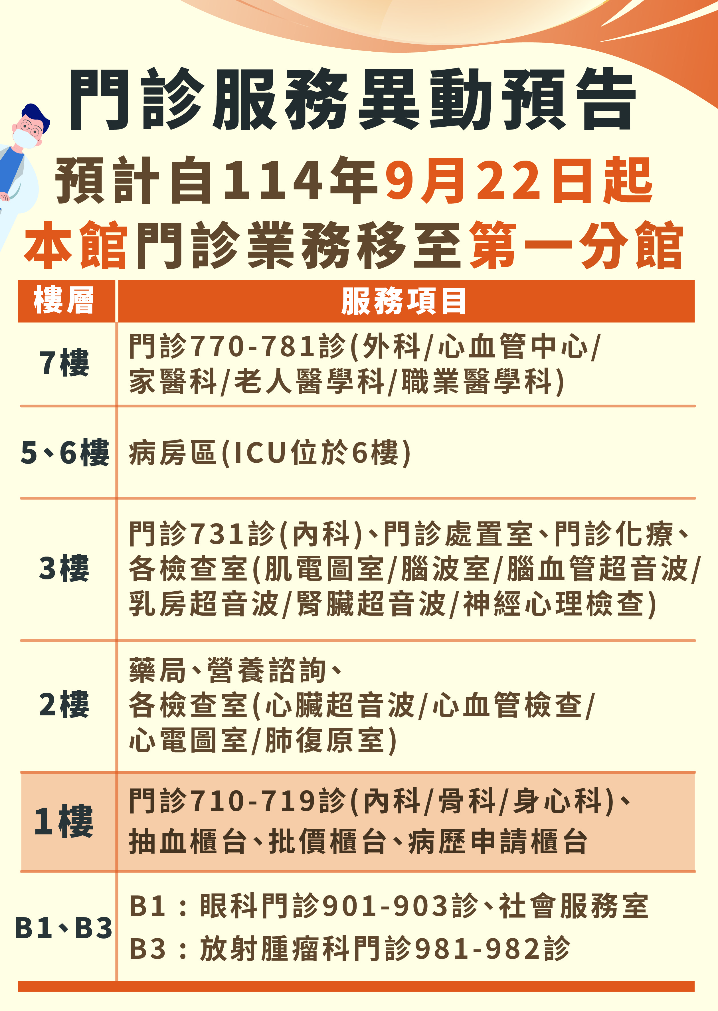 門診服務異動預告:9月22日起本館門診業務移至第一分館
