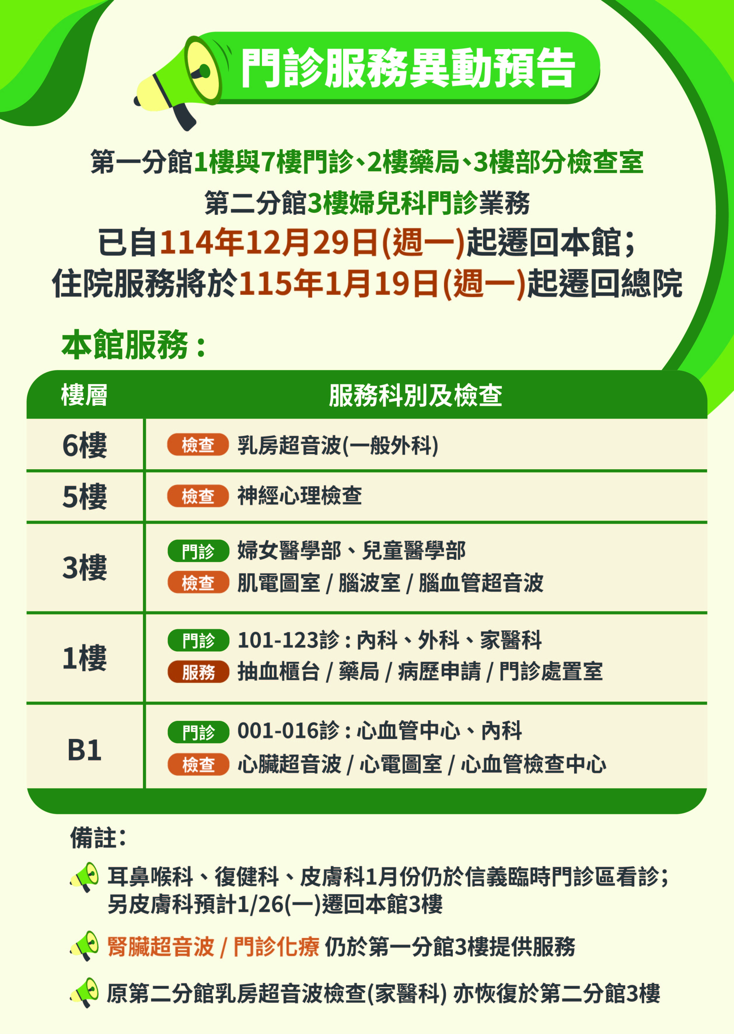 服務異動預告:住院服務將於115年1月19日起遷回總院